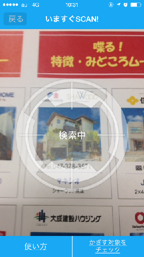 ※「SATCH VIEWER」アプリトップ内にある「いますぐSCAN!」からでも同様に新聞折込みチラシ中面のモデルホーム外観写真にスマホをかざしてSCANできます。 -