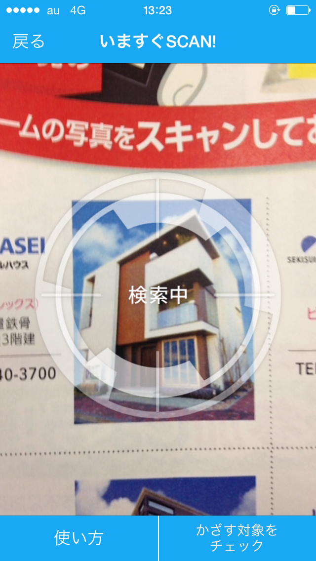 ※「SATCH VIEWER」アプリトップ内にある「いますぐSCAN!」からでも同様に新聞折込みチラシ中面のモデルホーム外観写真にスマホをかざしてSCANできます。
